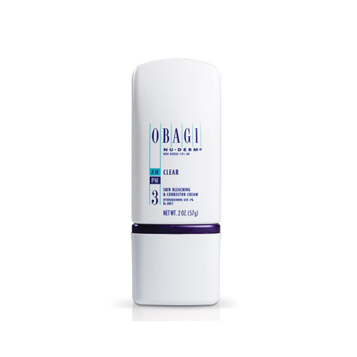 Obagi Nu-Derm Clear (Skin Bleaching and Corrector Cream) is the major bleaching and correcting preparation in the Nu-Derm Skin Health Restoration program. An essential component of the Therapeutic Cascade, Obagi Nu-Derm Clear contains 4% hydroquinone as the active ingredient in an activating base to correct uneven surface skin color and brown spots. NOTE: Do not use this product if pregnant or nursing.