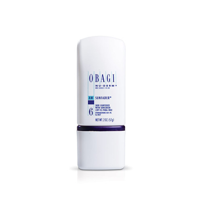 Obagi Nu-Derm Sunfader (Skin Lightener with Sunscreen) protects skin from ultraviolet damage while inhibiting pigment cell production that causes dark patches. Obagi Nu-Derm Sunfader contains 7.5% Octyl Methoxycinnamate and 5.5% Oxybenzone for protection from both UVA and UVB light rays and 4% hydroquinone. Application every 4 hours is recommended during sun expose. Note: Do not use this product if pregnant or nursing.